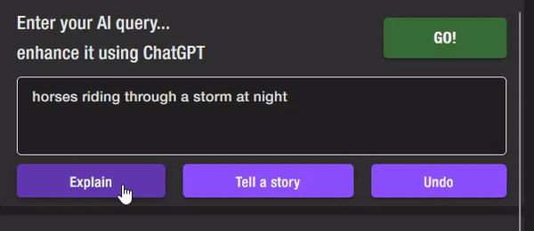 Use Ai to help you define and enhance your prompts. Our “Explain” and “Tell a Story” buttons use ChatGPT to help formulate the most creative and appropriate prompt while retaining the meaning of what you are striving for.